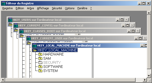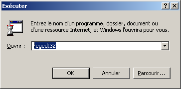 Pour modifier le registre, on utilise la commande regedt32.exe plutôt que regedit.exe