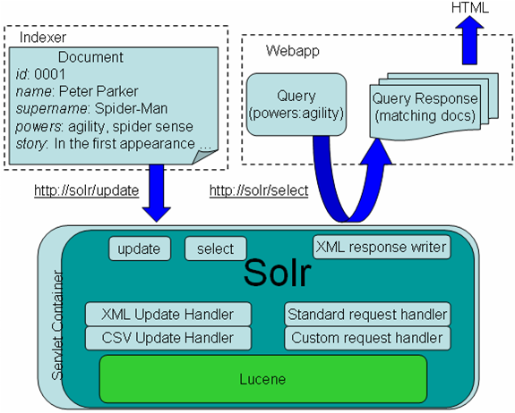 En dessous, est représenté Solr, dans son conteneur de servlets, avec Lucene comme socle.
