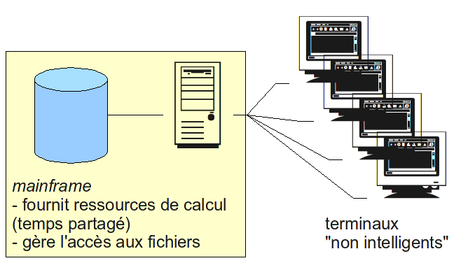 La problématique des systèmes de fichiers répartis est illustrée par la question de la centralisation de la sauvegarde et l'effet de balancier observé, reflet des évolutions des modes de travail au cours des années.Jusque dans les années 1970 les systèmes d'information déployés dans les entreprises étaient essentiellement organisés autour d'un serveur central, appelé mainframe, qui fournissait du temps de calculs ainsi qu'un espace de stockage aux terminaux non intelligents qui y étaient tous reliés. Les terminaux étaient encore assez rares.