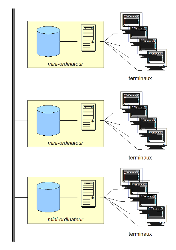Avec le développement des systèmes et l'augmentation du nombre de terminaux, le mainframe a été remplacé par plusieurs mini-ordinateurs. Chacun d'entre eux étaient relié d'une part à une dizaine de terminaux, et d'autre part aux autres mini-ordinateurs : autorisant ainsi un échange de données, toutefois limité.