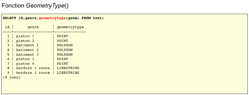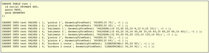 Sur ce exemple, on a crée une simple base de données avec deux champs de type Text et un champ de type GEOM. Ce type est défini dans l'extension postgis et permet de représenter plusieurs types de données géographiques dont le point, le rectangle et le polygone.