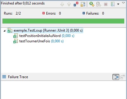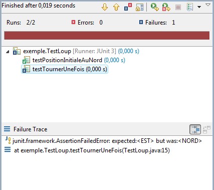 Execution du test et constater que la méthode testTournerUneFois échoue :