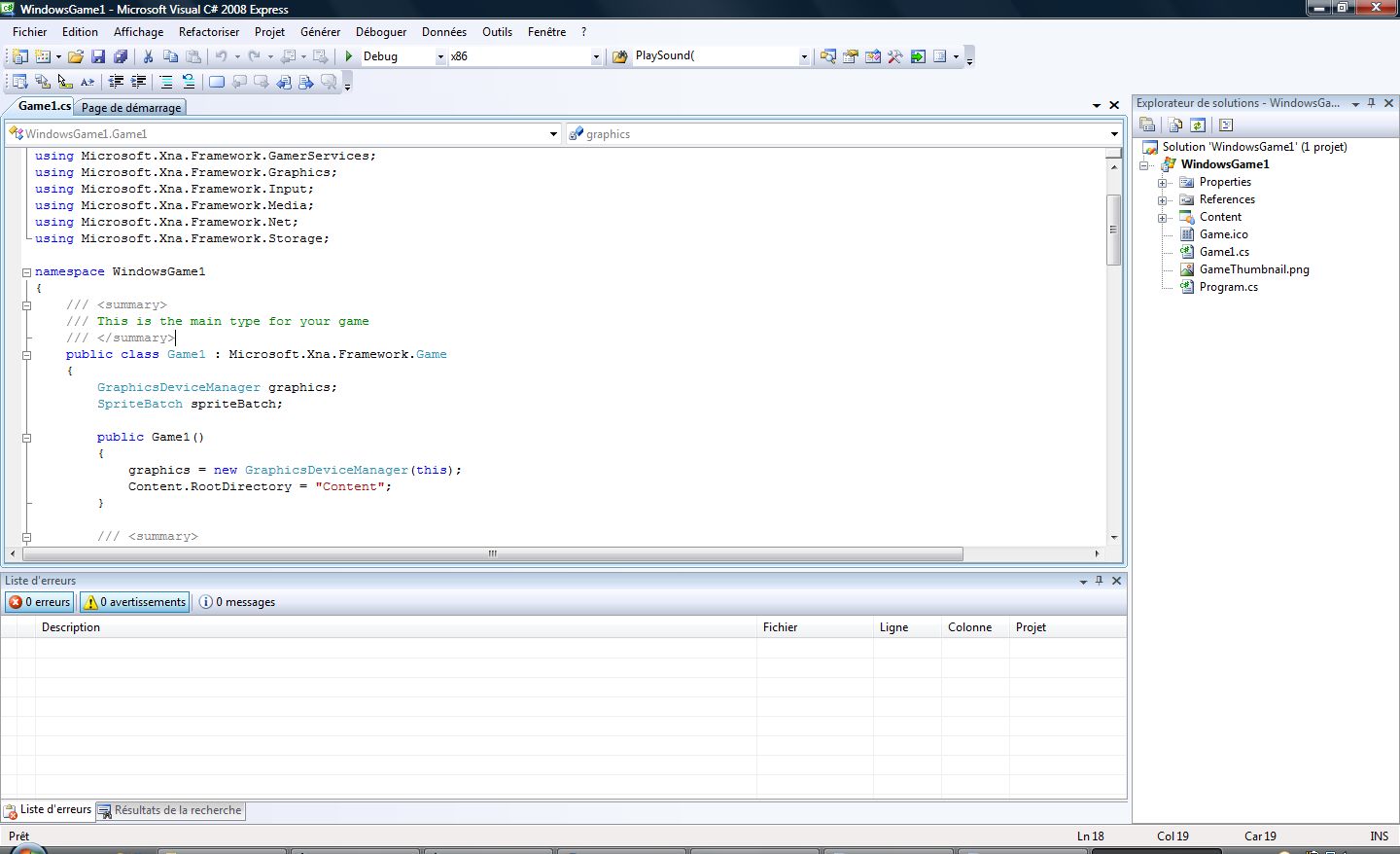 - Game1.cs représente la classe principale de votre jeu. C'est ici que seront gérées les différentes phases (Initialize, LoadContent etc.) de votre jeu.
