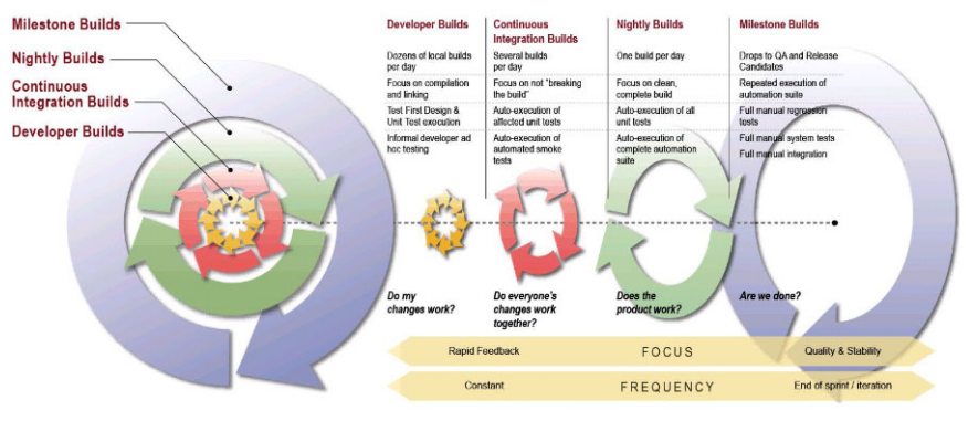 Il y a donc plusieurs types de builds. Le schéma ci-dessous les illustrent avec leur fréquence. On peut voir que plus le build est gros moins il est fréquent. C'est vraiment la philosophie de l'intégration continue, il ne faut pas faire perdre de temps aux développeurs. Le but est de se rendre compte des erreurs rapidement donc tout ce qui est build rapide sont fait le plus souvent possible et pour les builds plus poussés, on les effectue moins souvent.