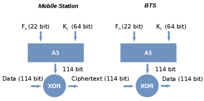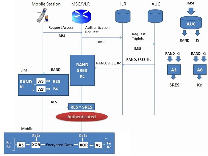 Si la réponse de l'abonné correspond, il est authentifié. Ensuite, les communications sont chiffrées grâce à l'algorithme A5 qui prend en paramètre une clé temporaire (Kc), dérivée de la clé secrète (Ki), et le numéro de la trame. A5 produit une "keystream" qui est ensuite couplée avec le message à chiffrer. C'est donc du chiffrage symétrique.