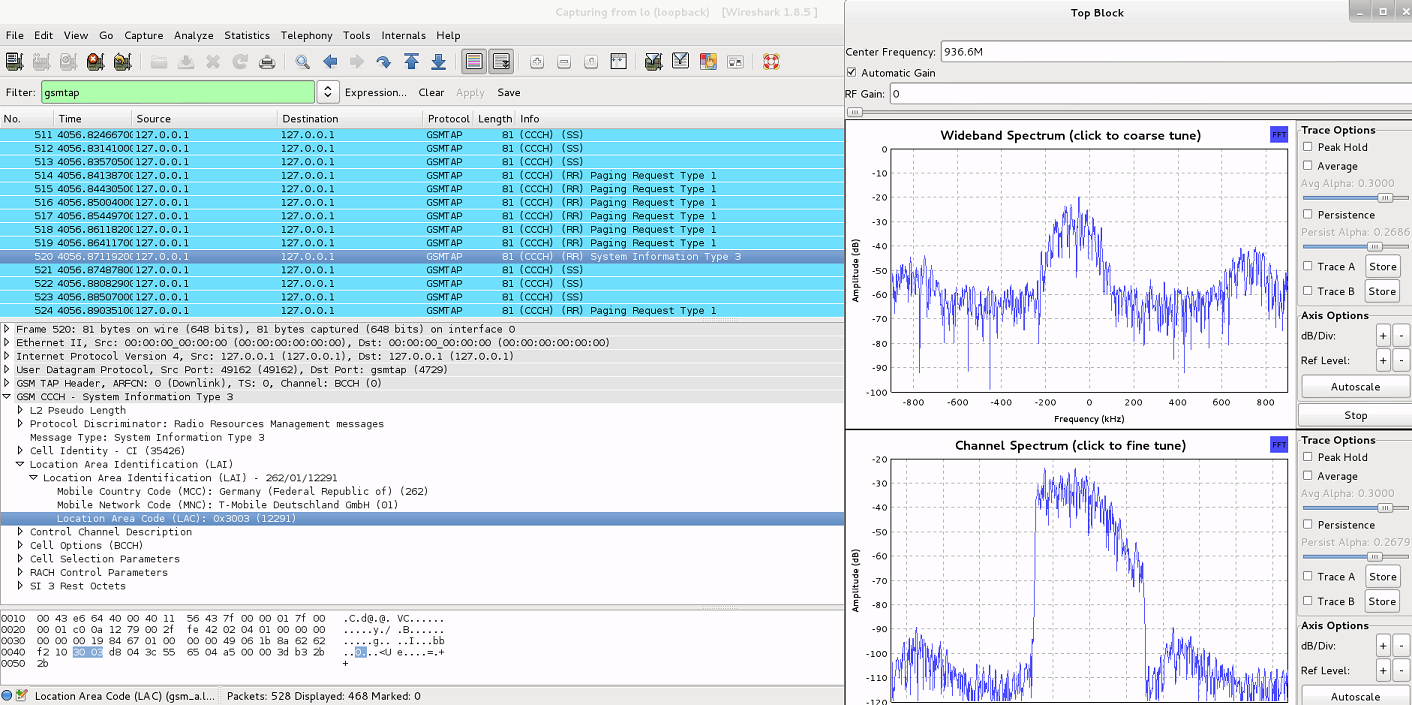 Dans un premier temps il faut capturer du trafic GSM grâce aux récepteur et aux logiciel GnuRadio. Dans Wireshark il est possible d'observer des trames chiffrées et non chiffrées. Nous pouvons observer ci-dessous le trafic capturé.