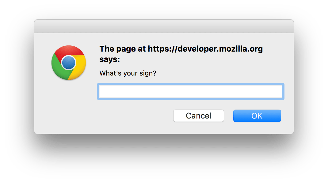 A prompt dialog contains a single-line textbox, a Cancel button, and an OK button, and returns the (possibly empty) text the user entered into that textbox.
