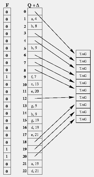 As we can see in DFA_matrix, the resulting matrix is often very sparse, hence the idea to reuse the empty cells to save memory space. Like matrix representation, it requires that a mapping from Sigma to integers exists and iteration on edge should be avoided on large alphabets. Compacting prcess, to be efficient, needs an average context size lower than the alphabet size. Moreover, the more the transitions are unevenly spread, the better. The drawback is major: a compact representation do not support side effect operations and thus is often used in static dictionnary implementation. |