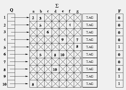 It is the most natural way to implement the set of transitions. It makes use of a (number of states * size of Sigma) matrix built from a container of pointers to pair of tag and vector of size |Sigma| holding aims of a particular state. F is a bit vector.![]() |